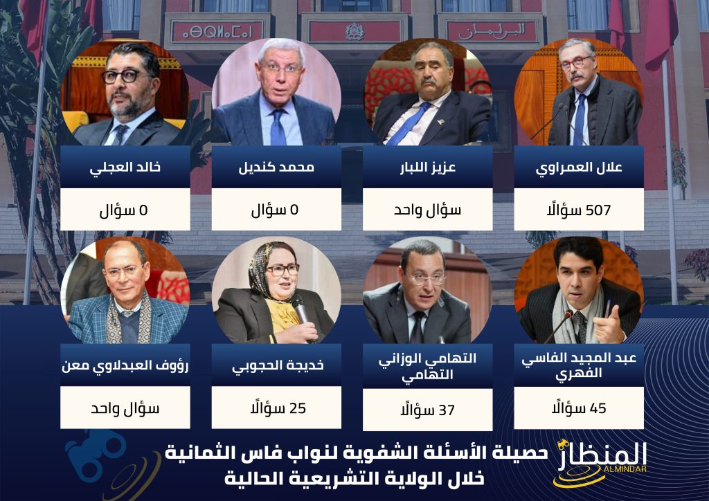 مع اقتراب الولاية التشريعية الحالية من نهايتها، تضع جريدة “المنظار 24” حصيلة الأداء الرقابي لممثلي العاصمة العلمية بمجلس النواب تحت مجهر المساءلة الرقمية. واستناداً إلى المعطيات الرسمية المسجلة بموقع مجلس النواب، تكشف لغة الأرقام تفاوتاً صارخاً في استثمار الآليات الدستورية للمساءلة بين نواب الدائرتين الشمالية والجنوبية.