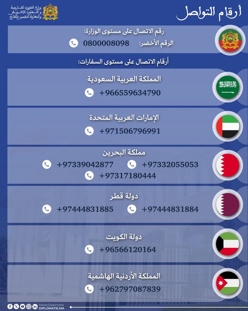 وقامت الوزارة بتخصيص مجموعة من الأرقام الهاتفية، وضعتها رهن إشارة أفراد الجالية المغربية بالشرق الأوسط. يمكن للمواطنين استخدام هذه الأرقام للتواصل المباشر مع خلية الأزمة للاستفسار.