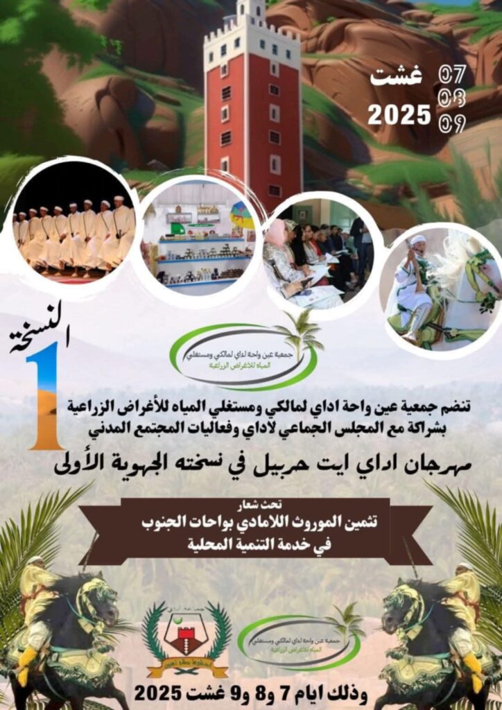 انطلقت فعاليات مهرجان أداي آيت حربيل في نسخته الجهوية الأولى، المنظم تحت شعار: “تثمين الموروث اللامادي بواحات الجنوب في خدمة التنمية المحلية”، وذلك وفق برنامج غني استقيناه من التصور الذي وضعته جمعية واحة أداي المالكي ومستغلي المياه لأغراض زراعية، بشراكة مع المجلس الجماعي لجماعة أداي، وبتعاون مع فعاليات من المجتمع المدني، في خطوة جماعية تسعى إلى خلق دينامية جديدة بالمنطقة، ترتكز على التراث كرافعة للتنمية.