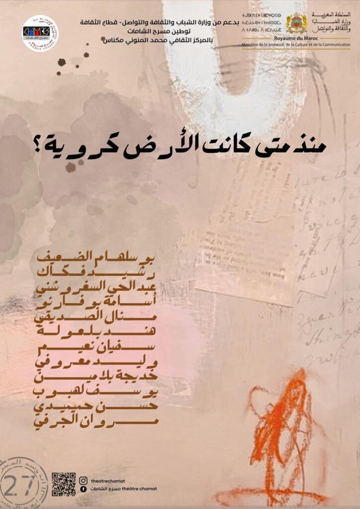 يبرز العرض المسرحي المغربي “منذ متى كانت الأرض كروية؟”، الذي قدم في إطار افتتاح الموسم المسرحي الجديد 2025-2026 لمسرح الشامات بمكناس، من إبداع نخبة من الفنانين: بوسلهام الضعيف، رشيد فكاك، عبد الحي السغروشني، أسامة بوفارنو، منال الصديقي، هند بلعولة، سفيان نعيم، وليد معروفي، خديجة بلامين، يوسف لهبوب، حسن حميميدي، مروان الجرفي. باعتباره نموذجًا لممارسة مسرحية تنبني على المراوغة الجمالية، وتشتغل على إعادة تشكيل الماضي ضمن الحاضر، من خلال بناء دراماتورجي ينفتح على إمكانات الأرشفة الرمزية والاشتغال الفلسفي على مفاهيم الزمن والهوية، ومساءلة أنماط التلقي وزعزعة الحدود التقليدية بين التاريخ والخيال، وبين الذاكرة والنسيان.