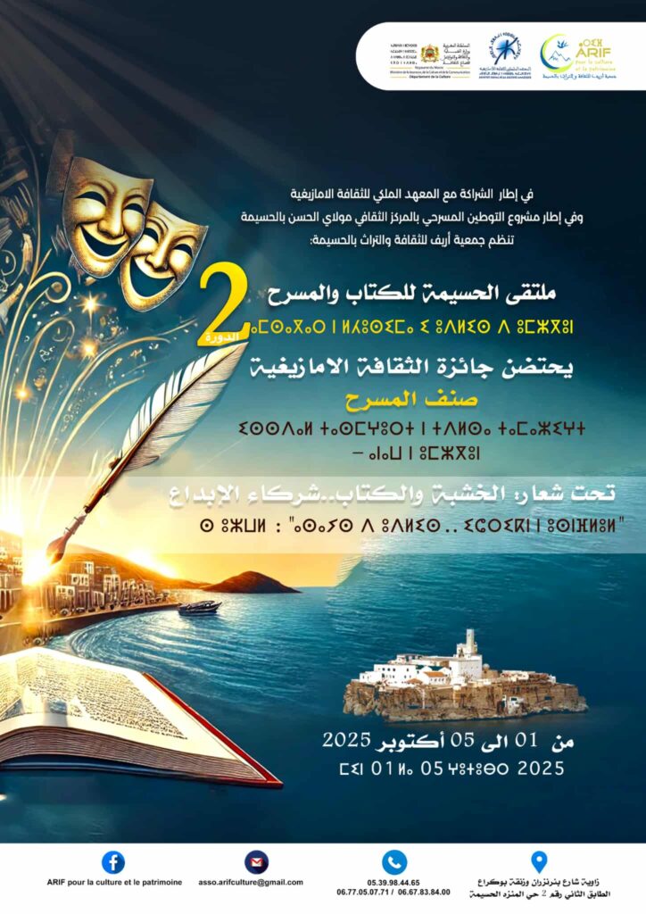 تستعد مدينة الحسيمة لتكون عاصمة للمسرح والكتاب في المغرب، حيث تحتضن الدورة الثانية من “ملتقى الحسيمة الوطني للكتاب والمسرح” في الفترة الممتدة من 1 إلى 5 أكتوبر 2025. يُنظم هذا الحدث الثقافي البارز من طرف جمعية أريف للثقافة والتراث، بشراكة استراتيجية مع المعهد الملكي للثقافة الأمازيغية، وبدعم من وزارة الثقافة والشباب والتواصل.