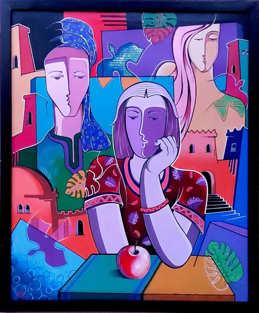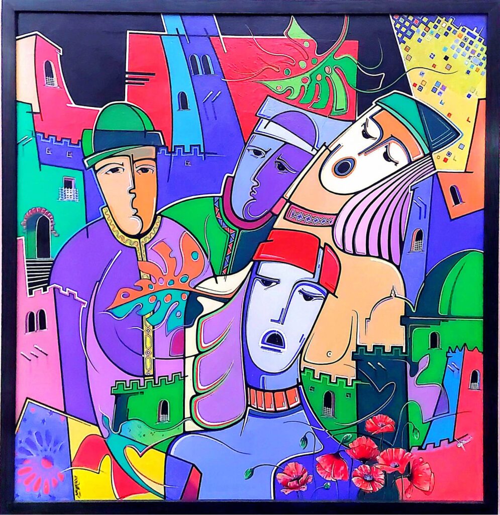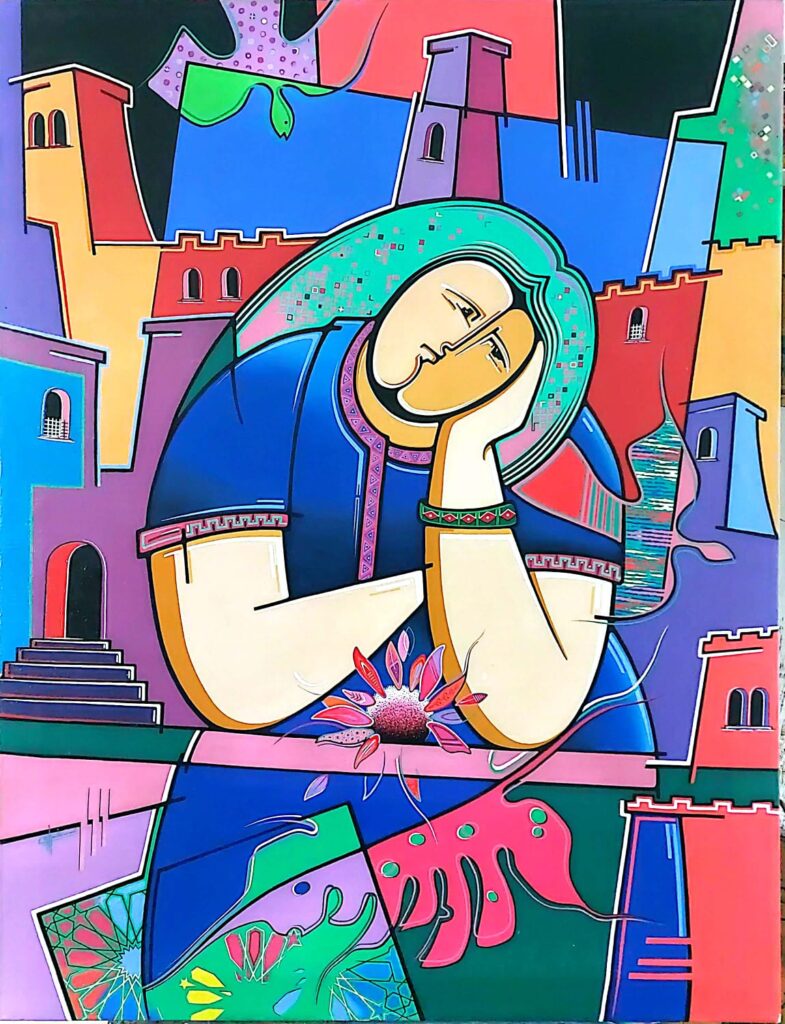 في لوحاته، يصبح اللون ذاكرةً، والخط مسارًا للروح، والتكوين بحثًا عن التوازن المفقود بين الإنسان ومكانه. ولعلّ هذا ما يمنح أعماله تلك القدرة على التأثير العاطفي والوجداني، إذ يشعر المتلقي أنه أمام لوحات تتحدث بلغته الداخلية، وتعيد ترتيب مشاعره ورؤاه، إن الجمال في تجربة نغراوي بوعبيد لا يختزل في التناسق البصري أو في الإبهار اللوني، بل هو قيمة وجودية تنبع من علاقة الإنسان بذاته وبالعالم. وهو في ذلك قريب من التصور الصوفي للجمال باعتباره “تجلّي الحقيقة في الصورة”، أي أن الجمال عنده ينقل الجوهر الإنساني من العتمة إلى النور، ويعيد للوجود معناه الداخلي، تُترجم هذه الفلسفة في اختياره للألوان الجريئة والمتضادة التي لا تُستخدم لإبهار العين، بل لإيقاظ الحواس وإثارة الوعي. فالتباين بين الأحمر والأزرق، بين الدفء والبرودة، بين الانغلاق والانفتاح، يُعبّر عن جدلية الحياة نفسها. الجمال عنده يولد من التوتر، ومن السعي الدائم نحو التوازن دون الوصول إليه تمامًا، وهذا المفهوم الجمالي يجعل لوحاته تتجاوز حدود الفن للزينة، لتصبح تجربة حسية ومعرفية تدفع المتلقي إلى التفكير في ذاته وفي العالم. فاللوحة ليست موضوعًا جماليًا فحسب، بل خطابًا بصريًا متعدّد الطبقات يُثير أسئلة حول الزمن، والمكان، والهوية، والأنوثة، والذاكرة، يمكن قراءة هذه النزعة الجمالية ضمن ما يسميه الناقد الفرنسي “موريس ميرلو-بونتي” بـ “الجمال المتجسّد“، أي الجمال الذي يُعبّر عن الفكر من خلال الجسد اللوني والشكل البصري. فالجمال هنا ليس شكلًا خارجيًا، بل تجسيدٌ لخبرةٍ روحيةٍ ومعرفيةٍ، وهي سمة أساسية في مسار بوعبيد الفني، فالرمز في تجربة نغراوي بوعبيد ليس زينةً شكليةً ولا إحالةً غامضة، بل أداة للتعبير عن الذاكرة الجمعية والهوية الثقافية، فهو يستحضر رموز المرأة، العمارة، اللون، والزخرفة العربية ليعيد بناء عالمٍ بصريٍّ مشبع بالمعاني المتراكمة، وهنا تظهر المرأة في أعماله لا كجسدٍ مرسوم، بل كيانٍ رمزيٍّ يختزل الأرض والوطن والحنين، فهي عنده أصل الحياة، ومصدر الضوء، ومجال الولادة المستمرة للمعنى، تتقاطع صورتها مع رمزية الأم الكبرى في الميثولوجيا الشرقية، ومع تمثلها في الفنون الإسلامية كرمزٍ للنور والسكينة، حيث يُحوّل بوعبيد المرأة إلى نقطة توازنٍ بين المادي والروحي؛ فهي تقف في لوحاته كأيقونةٍ تتوسط الفضاء، تُشعّ نورًا داخليًا يوحي بالأمل والصمود. بهذا التوظيف، تتحول الأنثى إلى علامةٍ على استمرارية الوجود، وإلى رمزٍ للخصب الفني الذي يولد من رحم الألم والذاكرة، غير أن حضور المرأة ا في أعماله لا يأتي من منظور جمالي سطحي، بل من رؤية فلسفية وإنسانية عميقة، فالمرأة عنده رمزٌ للخصب والعطاء والصمود، وهي تجسّد الأرض والذاكرة والانتماء، في كثيرٍ من لوحاته، تظهر المرأة ككائنٍ مهيب، مزيجٍ من الحلم والأسطورة، تحمل في ملامحها ملامح الوطن بكل تناقضاته وجماله. فهي ليست موضوعًا للتأمل الجمالي، بل كائن رمزي تختزل من خلاله مفاهيم الحياة والموت، الزمن والمكان، والهوية والحرية، وتتخذ المرأة في أعماله أشكالًا هندسية متوازنة، تنسجم مع خطابه التكعيبي، لكنها تحتفظ بليونة الحركة الشرقية ودفء اللون العربي. في عينيها يسكن الحنين، وفي وقفتها يتجلى الكبرياء، وفي تفاصيلها يتكرر حضور الأرض كعنصرٍ روحي لا مادي. إنها صورة الأمة في أوجها وانكسارها، ورمز الأمومة في بعدها الوجودي والثقافي معًا.