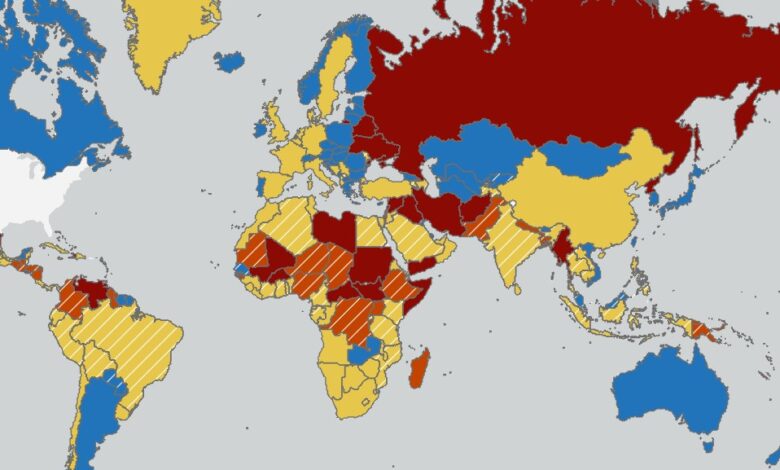 وحسب المعطيات الرسمية، فإن المغرب يندرج ضمن اللون الأصفر الذي يدعو إلى “ممارسة الحذر المتزايد” عند السفر إليه، في حين أن الجزائر مصنفة في المستوى نفسه (الأصفر تتخلله خطوط بيضاء) لكن مع تحذيرات أشد في مناطق واسعة، من بينها مناطق يُنصح بعدم السفر إليها مطلقاً بسبب التوترات الأمنية.