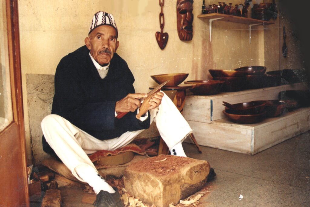 إن تجربة رشيد شعرير هي في جوهرها رحلة في الإنصات؛ إنصاتٌ للمادة كما للحياة، وللجذور كما للأفق، لقد ظلّ أمينًا لتلك اللحظة الأولى التي لامس فيها الخشب بيده الصغيرة، حين أدرك أن الفن لا يولد من الرفاهية بل من الحميمية، من علاقةٍ حقيقية بين الإنسان والعالم الذي يحيط به. لذلك يمكن القول إن مسيرته ليست مجرد تطور مهاري، بل هي استمرارية روحية لطقس طفولي تحوّل إلى فلسفة في النظر والخلق، هكذا، انبثق من عمق تلك الطفولة المتشظية في دوار صغير فنانٌ يبحث في المادة عن اللامرئي، وفي الشكل عن المعنى، وفي الضوء عن ذاكرة المكان، وفي الوجود قيمة مضافة لمعنى الانوجاد، ولعلّ ما يميز رشيد شعرير أن أعماله تسعى إلى تمجيد الخشب وإلى الإصغاء إلى صمته، لأن الصمت – في عالمه التشكيلي – هو اللغة الأولى للجمال، والفراغ هو المساحة التي تنبعث منها الحياة. يصف الفنان التشكيلي رشيد شعرير والده بـ “المعلّم الأول”، وهو توصيف يتجاوز حدود العاطفة الأُسرية ليبلغ عمقًا تربويًا وجماليًا نادرًا؛ إذ لم يكن الأب مجرّد حِرفيٍّ يشتغل على الخشب، ولكنه كان مربّيًا بالمعنى الفني للكلمة، في ورشته الصغيرة بقرية تجماصت، كان الابن يتعلم أبجدية الصبر والدقة والانصات، من إيقاع المطرقة على الخشب، ومن الفراغ الذي يسبق النقشة الأولى، ومن رائحة الأرز والعرعار والجوز التي كانت تختزن ذاكرة اليد والزمان، كان الأب يقول لابنه دون أن يتلفّظ “الفن ليس ما تراه العين، بل ما تكتشفه اليد حين تصغي”، هذه الفلسفة الصامتة كانت درسَه الأول في الجمال، لقد شكّل الأب نموذجًا لما يمكن تسميته بـ التربية الجمالية التقليدية، تلك التي تتأسس على الفعل والممارسة، لا على القول والتلقين. فبينما كان الطفل يراقب كيف تتحول قطعة الخشب الجامدة إلى شكل نابض بالحياة، كان في العمق يتعلم كيف يترجم الصمت إلى معنى، وكيف تتحول الدقة الحرفية إلى حسٍّ جماليٍّ داخلي، ولعلّ هذا ما جعل رشيد شعرير ينظر لاحقًا إلى الخشب لا باعتباره مادة صلبة، بل ككائن حيٍّ يحمل في تجاويفه صوت الزمن، وكأن الفن كله تمرينٌ على الإصغاء إلى هذا الصوت العميق. غير أن التجربة التكوينية لابن تنغير لم تقف عند حدود الورشة العائلية. فقد مثّلت المدرسة المغربية في ثمانينيات القرن الماضي الفضاء الثاني لتكوينه الجمالي. هناك، في فصولها البسيطة وساحاتها المزدحمة، اكتشف أفقًا جديدًا للجمال، أفقًا جماعيًا يحتفي بالخيال والهوية والاحتفال الوطني، كانت مسابقات الرسم المدرسية واحتفالات عيد العرش (الثالث من شهر مارس من كل عام) والمناسبات الوطنية، لحظاتٍ يتفجر فيها ذلك الشغف الطفولي باللون والشكل، في تلك البيئة، بدأ شعرير يدرك أن الفن لغة تواصل تتجاوز الحرفة الفردية إلى الفعل الجماعي، وأن اللوحة يمكن أن تكون ساحة لقاء بين الذاكرة والخيال، في هذه الفترة، سيكون الأستاذ والفنان التشكيلي محمد حستي، ذو الأصول الأمازيغية العميقة بثقافتها وحكمتها، يقول رشيد شعرير:”كان محمد حستي معلّمًا يلقّن الحرف واللون، ومربّيًا يغرس فينا حب الجمال والمسؤولية، وصديقًا يجعل من المشرفة درسًا في الإنسانية، وفنانًا ملهِمًا أشعل في داخلي الشرارة الأولى للفن، حفزني كثيرا للمشاركة في كل المسابقات وكنت دائما الفائز الأول، وغالبا ما كان يصحبني إلى منزله لكي اشاهد أعماله وأتلمس طرق اشتغاله، حقا كان صديقا أكثر منه أستاذا، ذات يوم طلب مني بحثًا عن الصناعة التقليدية، إدراكًا منه لجذوري الحرفية، قدّمت له ملفًا غنيًا عن فنّ الخشب والزربية الأطلسية، فكانت تلك اللحظة ولادتي الأولى مع الفن، وإلى جانب المدرسة، انفتح على فضاء آخر لا يقل أهمية، دار الشباب القدس بمدينة فاس عام 1989، التي كانت في تلك الفترة منبعًا لتجارب إبداعية واعدة، هناك شارك في ورشات الرسم والمسرح، وانخرط في إعداد الديكورات الركحية لعروض الهواة، فاكتشف العلاقة المعقدة بين الفضاء واللون، بين الحركة والظل، بين الكلمة والصورة، لقد كانت تلك التجرب
