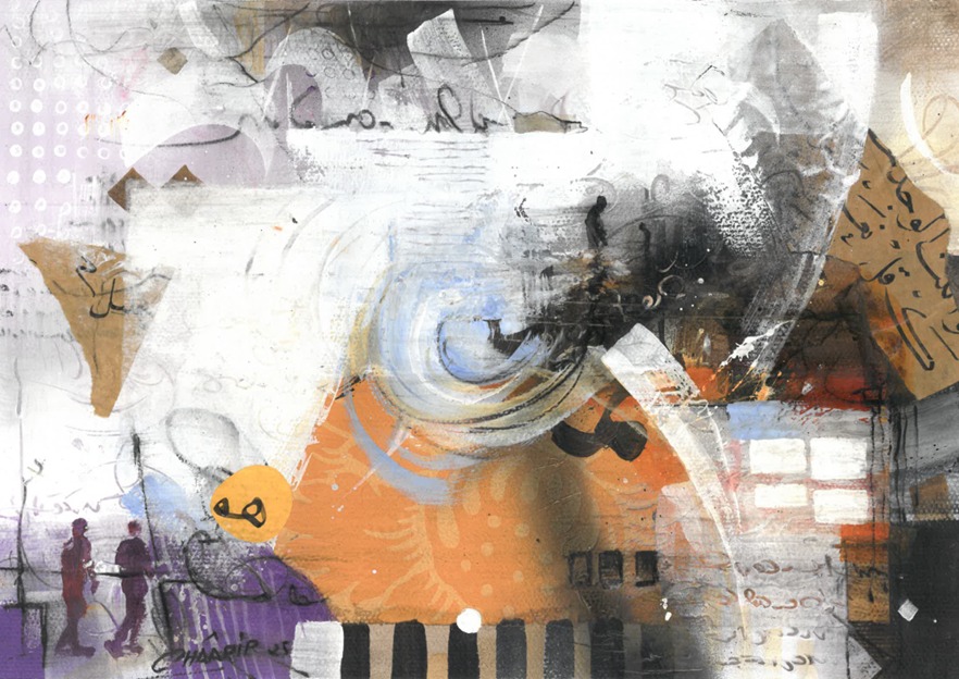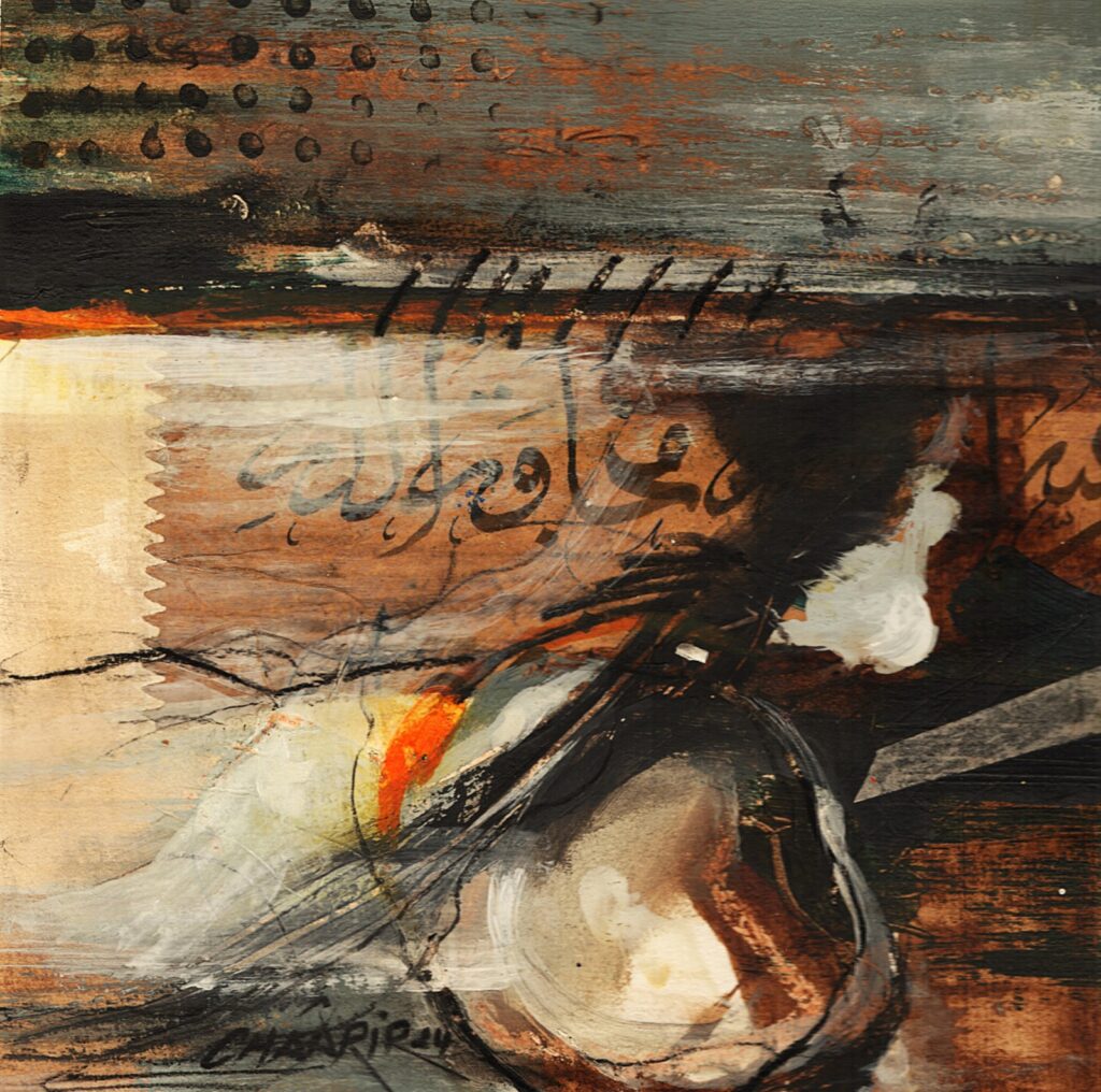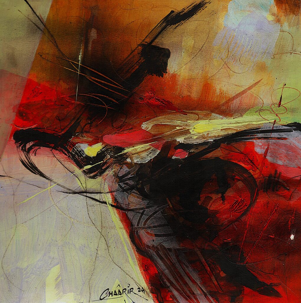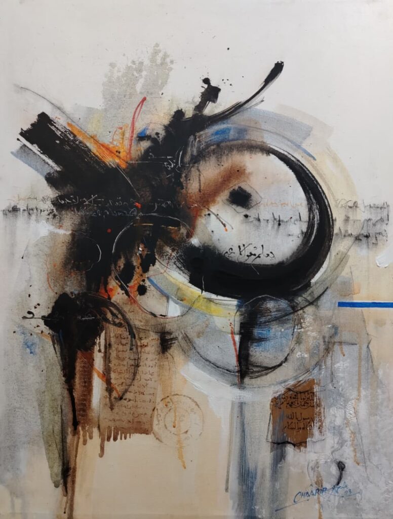 تبدو أعمال رشيد شعرير فضاءً تأمليًا مفتوحًا يتمدد وفق بواعث المتلقي وإيحاءاته، بما يعزز تجربته التأويلية الخاصة، يمكن القول إنها تتسم بتنوعها التقني والفكري، فهي ثمرة مسار طويل من التجريب والبحث في جوهر الحرف واللون والضوء والفضاء، اشتغل على تقاطع الخط العربي والفن التجريدي، مستحضرًا الحرف لا كعنصر زخرفي جامد، بل ككائن بصري نابض بطاقة رمزية وجمالية، يتجاوز وظيفته اللغوية ليغدو أثرًا وجوديًا يختزن أسئلة المعنى والعدم، فهو لا أنتمي إلى مدرسة محددة، بل ينتهج أسلوبًا حروفيًا تجريديًا يميل أحيانًا إلى المدرسة الغنائية، وأحيانًا أخرى إلى التجريدية الروحية، في أفقٍ منفتح على مقاربات الفن المفاهيمي والتنصيبي المعاصر، وعلى اختراق إطار اللوحة نحو فضاءات تشكيلية أوسع وأكثر تحررًا، تتغذى موضوعاته من الصورة الشعرية على المستويين النفسي والرمزي، ومن التأملات الوجودية التي تبحث عن لحظة توازن بين المعنى والفراغ، وبين الصوت واللون، وبين الذات والعالم، فالعلاقة بين الامتلاء والفراغ، وبين الضوء والظل، تمثل محورًا حسّاسًا في رؤيتي البصرية، إذ يتحول الفراغ إلى فضاء ناطق بالإيحاء، محاولًا تحويلها من زمن لغوي إلى زمن ضوئي وتكويني، أما على مستوى التقنيات، فتعتمد أعماله على العفوية والمجازفة) مجازفة محسوبة برهانات الدرس واستشراف الأفق) إذ آمن بالأداء المباشر وبالطاقة الانفعالية للحظة الخلق، يزاوج بين الحبر العربي والأصباغ الطبيعية أو الأكريليك، مستحضرًا البعد التراثي والصدق التاريخي للحرف العربي، ويضيف أحيانًا مواد شفافة ليصبح الضوء جزءًا من البنية التشكيلية، مولّدًا عمقًا روحيًا يتجاوز الأثر البصري البحت، كما يوظّف تقنية الكولاج مستخدمًا مخطوطات وأوراقًا مهملة، لبناء طبقات حسية من اللون والحبر تتجاور فيها صلابة السطح وشفافية المادة في حوار دائم بين الأصيل والمعاصر. فالحرف في هذا السياق ليس حضورًا شكليًا، بل أثرًا روحانيًا يوحي ببقايا لغة أزلية تتنفس في صمتها الخاص، تشكّل “اللطخة” في أعماله ضرورة حتمية، ليست انفجارًا شكليًا بل علامة وجدانية تنبع من انفعال لحظي، حيث تمتزج العفوية بالتأمل والمجازفة بالسيطرة، لا يخطط مسبقًا لتوزيع الألوان كما في الرسم الأكاديمي، بل يصغي إلى المادة وهي تتكلم، ينصت إلى توتر الحبر وجريان الأكريليك وتفاعل الماء والهواء على السطح، محاولًا القبض على الإحساس قبل أن يتبلور في شكل، إنها لغة ما قبل الكلمة وصوت اللون قبل المعنى، حيث تتوازن التلقائية مع حساسية التكوين في جوهر روح المغامرة، اعتمد رشيد شعرير على تقنية تراكب الطبقات عبر الرشّ أو السيلان أو المسح الجزئي أو الخدش، بما يمنح السطح ملمسًا زمنيًا يحتفظ بأثر كل لحظة انفعال أو سكون، ليتحوّل إلى مسرحٍ لحوارٍ بين الإرادة والعفوية، وبين النظام والفوضى، من هذا المنظور، سعت تجربته إلى إعادة الحرف العربي إلى جوهره الأنطولوجي، كعنصر يربط الروح بالمادة، ويحوّل اللوحة إلى فضاء للبحث في الجوهر الخفي للجمال والمعنى. فالحرف عنده ليس نقشًا بصريًا، بل كيانٌ يتنفس في الضوء ويذوب في الفضاء، علامةً للوجود ذاته، تحمل أعماله بُعدًا فلسفيًا يستبطن سؤال الوجود الإنساني من خلال الحرف واللون، مستدعيًا العلاقة بين المادي واللامرئي، بين الفناء والخلود، في سعي دائم لتحويل الصمت والزمن إلى أثر، والغياب إلى حضور بصري نابض بالحياة.